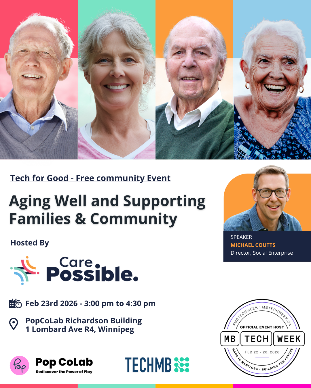 Among more than 50 events celebrating made-in-Canada innovation across Winnipeg, Winkler, and Morden, Care Possible is proud to host a Tech for Good session focused on Aging Well and Supporting Communities. As a not-for-profit social enterprise created by the 75-year-old nonprofit Manitoba Possible, this session explores how technology can help Manitoban families navigate caregiving, coordination, and decision-making while supporting healthy aging.